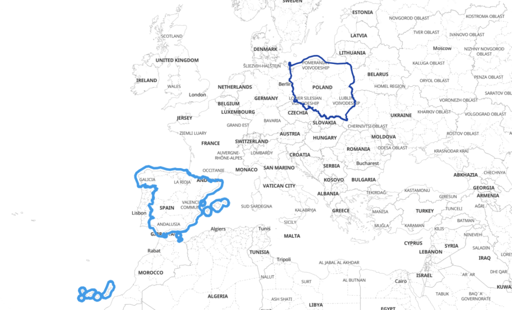 - Global Horizontal Irradiance (solar potential) is much higher in Spain (4.50 W/m² compared to 2.97 W/m² in Poland). This indicates better suitability for solar farms.