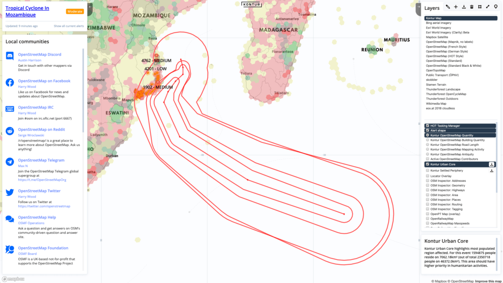 During disasters like Cyclone Idai in 2019, the 2018 Ebola outbreak, or the 2015 Nepal earthquake, improving and updating OpenStreetMap data has proven to be an effective way to help response efforts. Disaster Ninja is a tool for the OpenStreetMap community that makes it easier to prepare and prioritize mapping tasks and save precious time during a crisis.